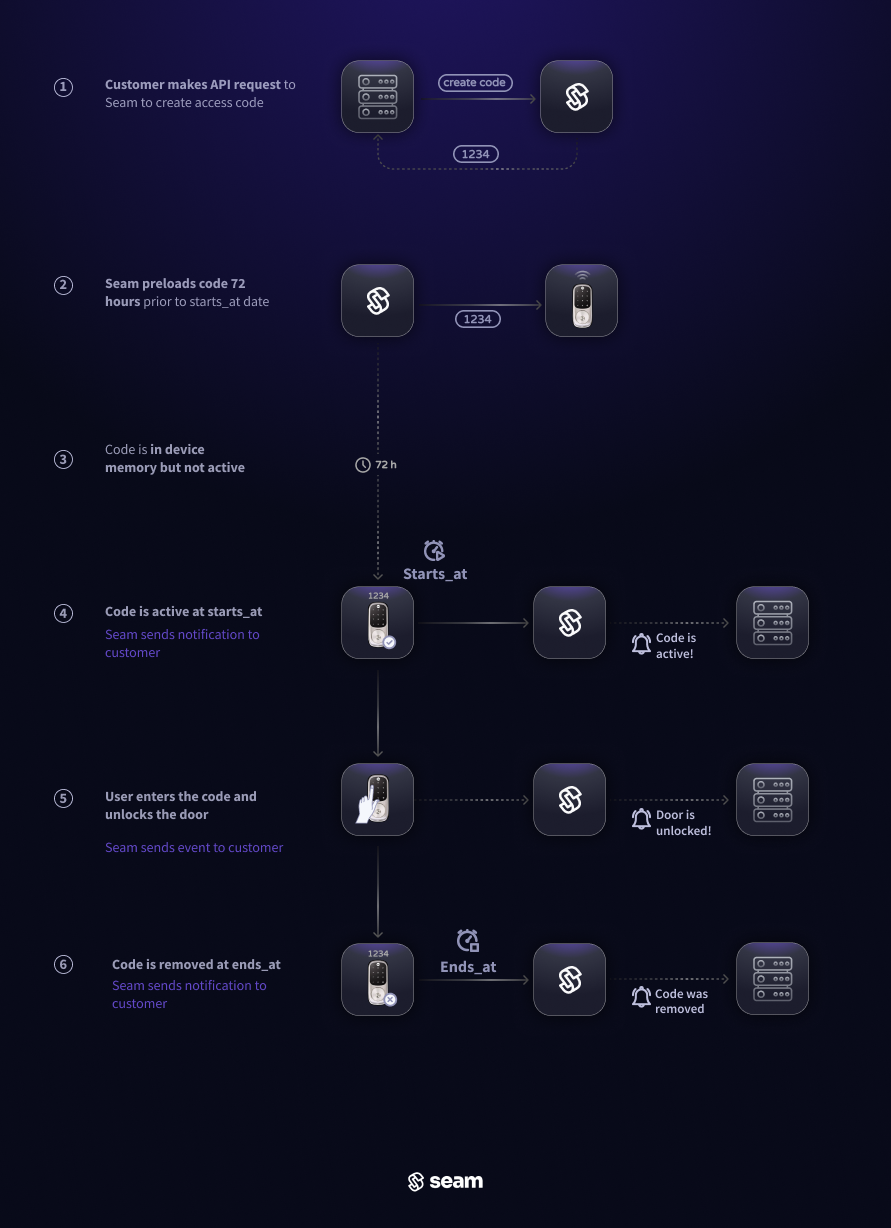 <figure><img src="https://2727122207-files.gitbook.io/~/files/v0/b/gitbook-x-prod.appspot.com/o/spaces%2FxnN2A67918om1UthYWsF%2Fuploads%2Fgit-blob-4d1997d40b8320e2d0c9eece719bce56c4553085%2Fnative-code-programming-dark.png?alt=media" alt=""><figcaption><p>72 hours before the <code>starts_at</code> timestamp, Seam inserts the code into the device's internal memory. When the <code>starts_at</code> time arrives, the device automatically activates the code. It is then automatically deactivated at the <code>ends_at</code> timestamp.</p></figcaption></figure>