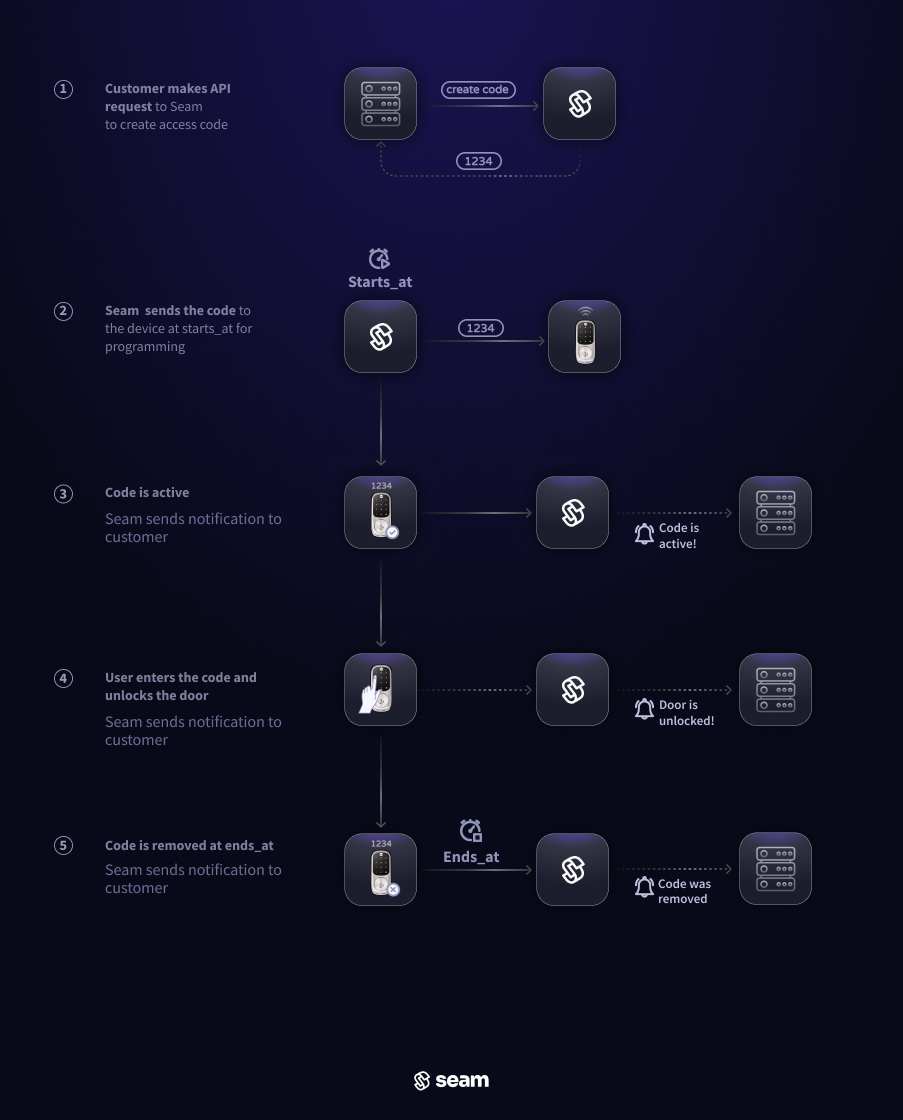 <figure><img src="https://2727122207-files.gitbook.io/~/files/v0/b/gitbook-x-prod.appspot.com/o/spaces%2FxnN2A67918om1UthYWsF%2Fuploads%2Fgit-blob-854470dc7abb7d77cf98b0235b6917fad26f4d89%2Fjust-in-time-programming-dark.png?alt=media" alt=""><figcaption><p>When the <code>starts_at</code> time arrives, Seam adds the code to the device and activates it. It is then automatically deactivated at the <code>ends_at</code> timestamp.</p></figcaption></figure>