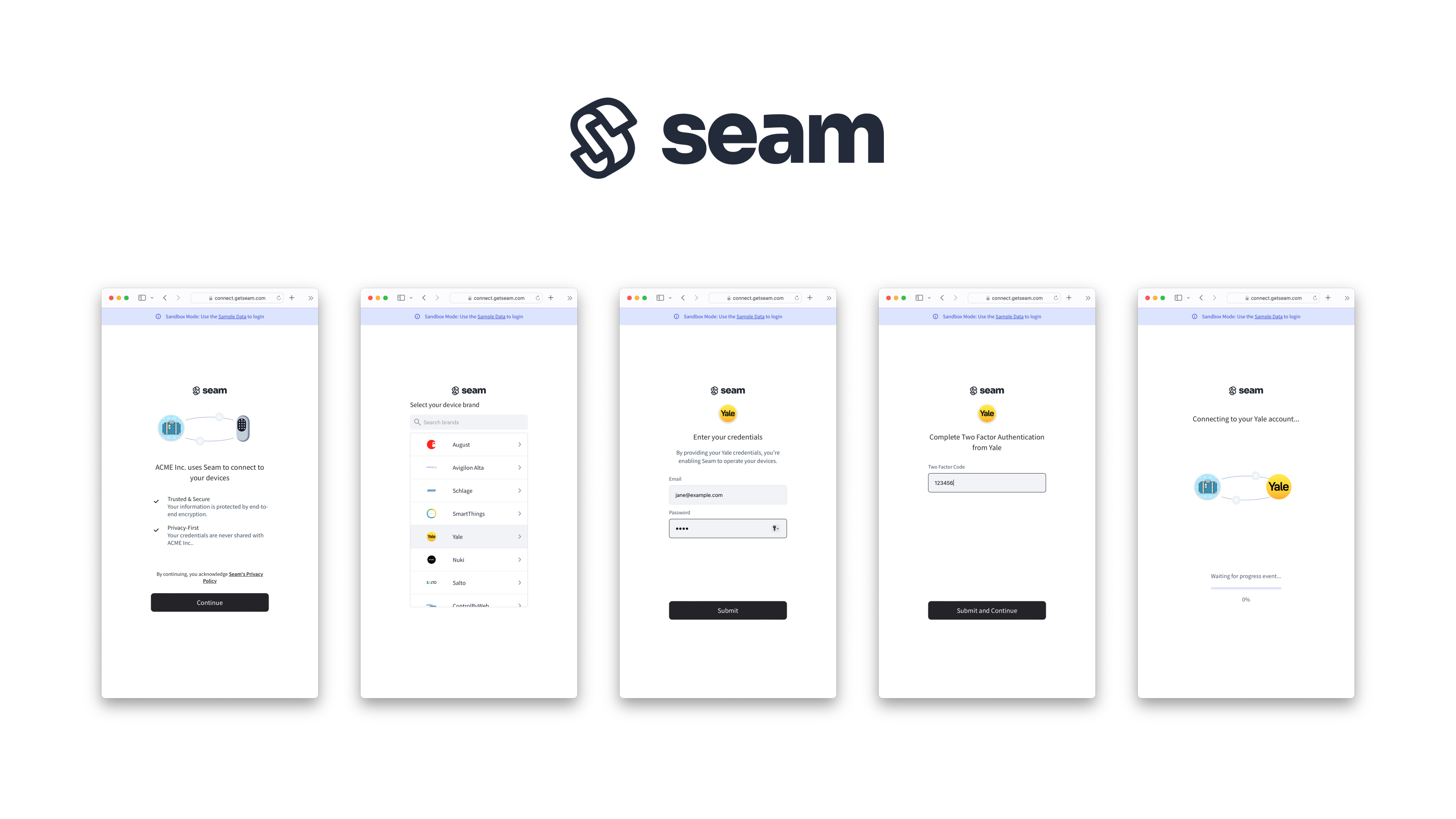 <figure><img src="https://2727122207-files.gitbook.io/~/files/v0/b/gitbook-x-prod.appspot.com/o/spaces%2FxnN2A67918om1UthYWsF%2Fuploads%2Fgit-blob-9440dcf6ca505ded9dd3328857b310977589e48d%2Fsmart-lock-connect-flow-screens.png?alt=media&#x26;token=fd07a600-35b2-43c5-b1d0-ce3f5c855897" alt=""><figcaption><p>Seam Connect Webview flow to connect an account with Seam</p></figcaption></figure>